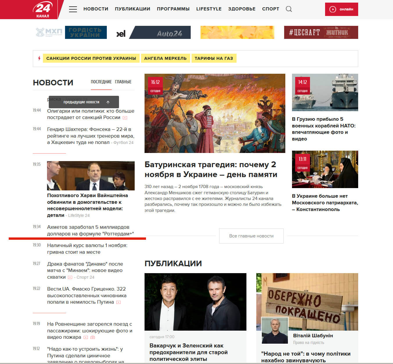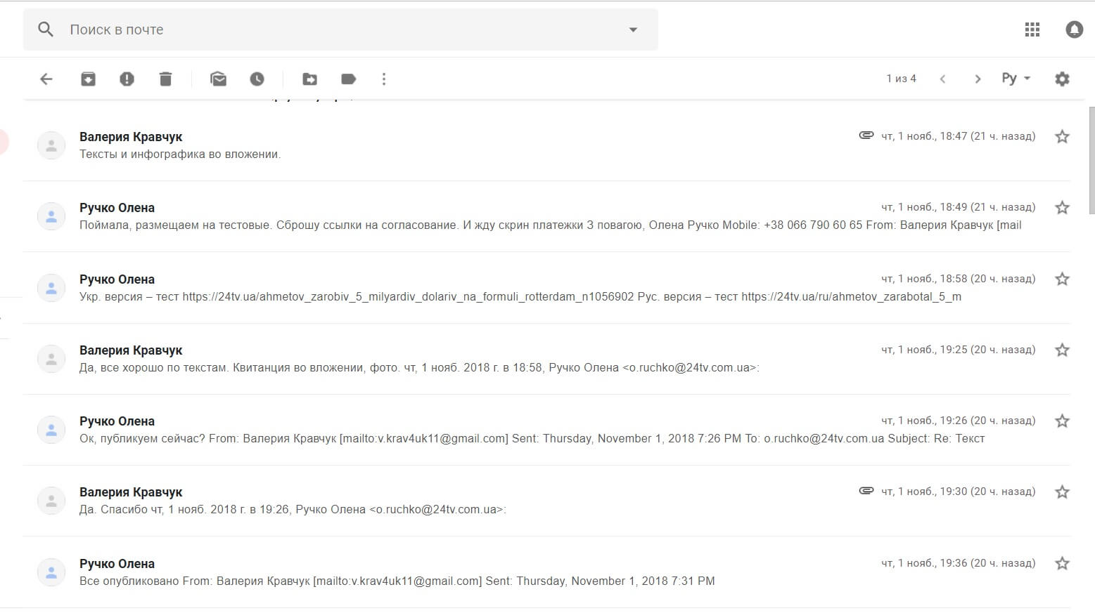Then the participant of “Passion” project contacted “24” TV channel’s managers, and after brief negotiations (screenshots and audios are in the commentaries) they approved the material and agreed on its cost (400 USD), and after receipt of payment from us they posted it. Once again, they posted it as the editorial news, without any advertising text boxes. Everything was done very quickly – “Maryna Danylevych’s” article appeared on RBC-Ukraine on October 30, and on November 1, the news was reposted on “24” TV channel’s website.