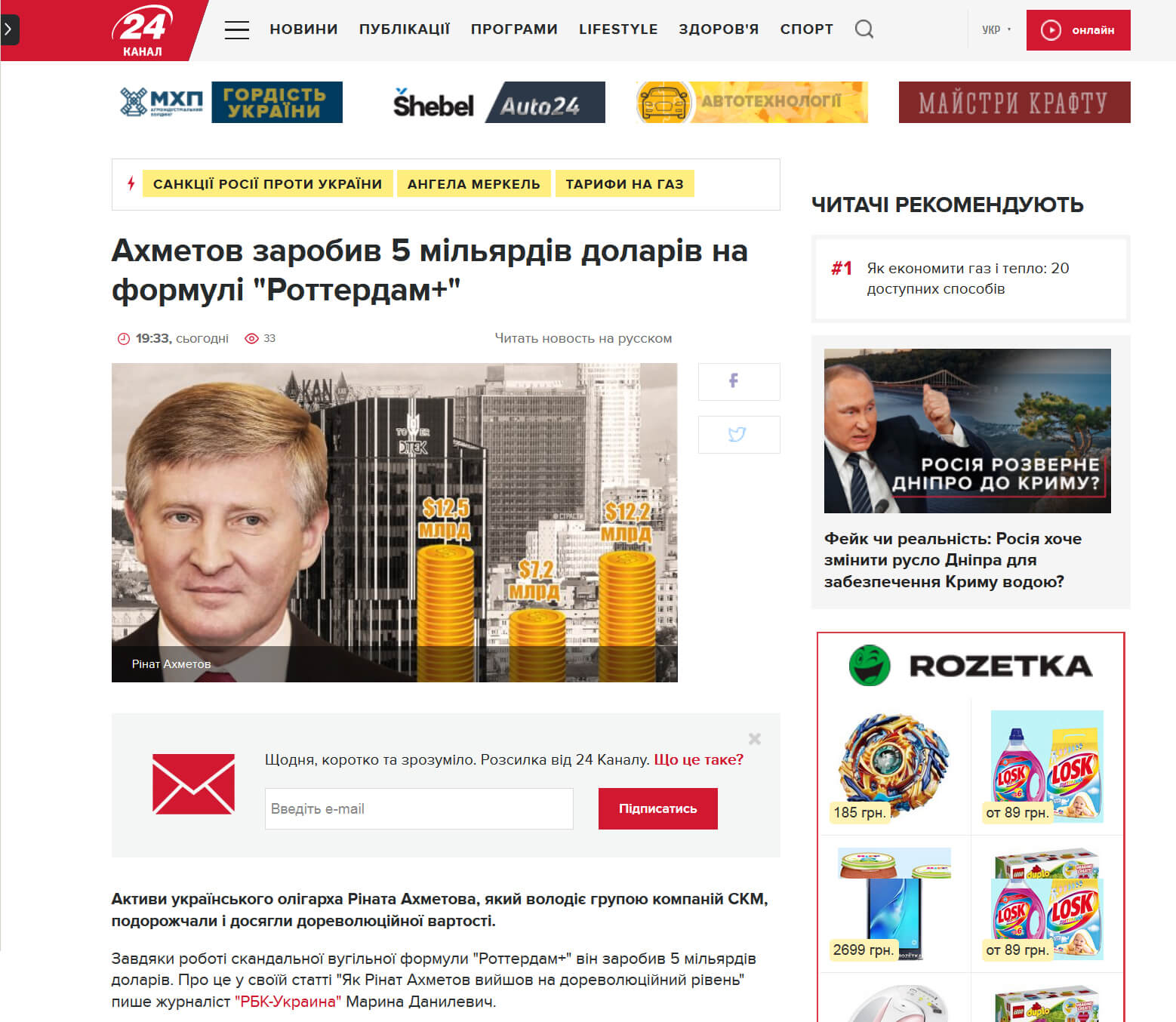 The “Plugola” to be posted was the most unreliable and unbalanced, by an anonymous author. To do this, we turned to the website of the RBC-Ukraine news agency and took the last opus of Maryna Danylevych from there. This is a non-existing character, whose name RBC-Ukraine owner Yosyp Pintus uses to mark the promoted stories. We turned the article into a news item, further reinforcing it with frankly absurd headline “Akhmetov profited $ 5 trn off Rotterdam+ formula”. It is frankly absurd, because even Kolomoiskyi’s freelance worker A. Herus with his counter of the same name counted that the “damage” by “Rotterdam” was 35 bln UAH, i.e. 1.25 bln USD.